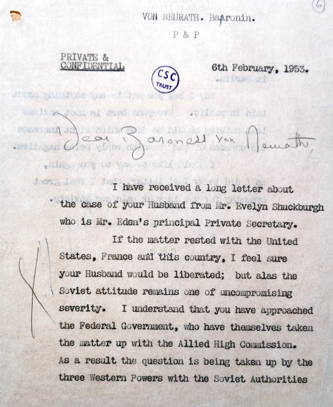 Years after the verdict, imprisoned defendants made pleas for early release. Baroness von Neurath wrote to Clementine Churchill, begging for her husband’s sentence to be reduced. In the letter to the right, Clementine Churchill responds, showing sympathy for the Baroness’s situation while expressing the political difficulties of the request. Von Neurath was eventually released in 1954, due to ill health. Several other convicted criminals had their sentences reduced, with the hope of fostering better relations with the West Germans during the Cold War. Lead largely by the Americans, this pattern of leniency was especially opposed by the Soviet Union and members of the prosecuting committees. While controversy persisted over maintenance of the expensive Spandau prison, it continued to house IMT criminals until the death of its last inmate, Rudolf Hess, in 1987.