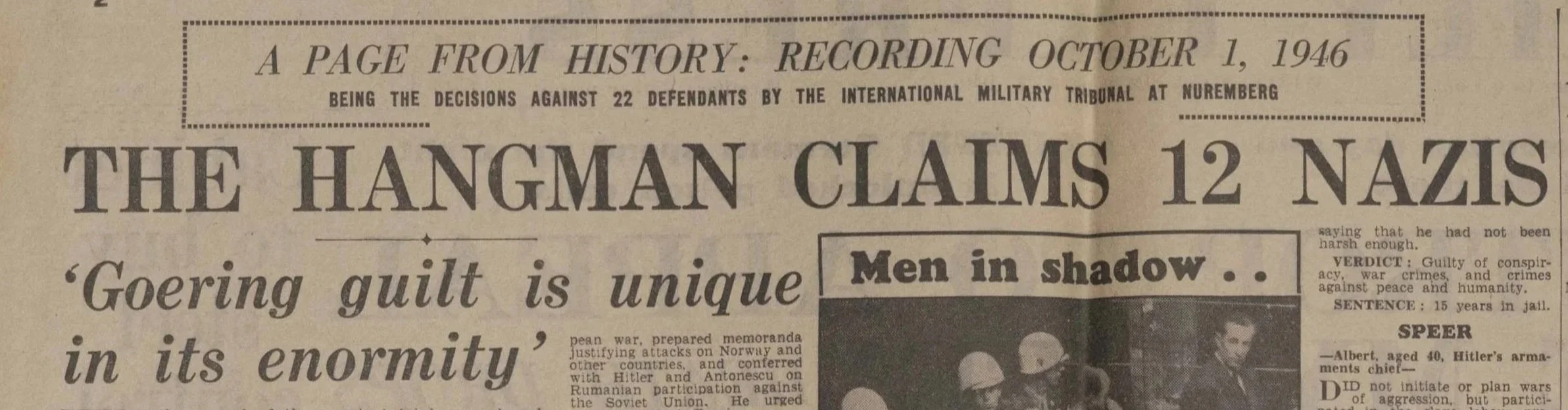These newspaper headlines from 1946 colour the trials with dramatic flair, especially giving coverage to reactionary stories, or stories outside of the courtroom. The defendants are mocked for their rage, anguish, or stupidity.
